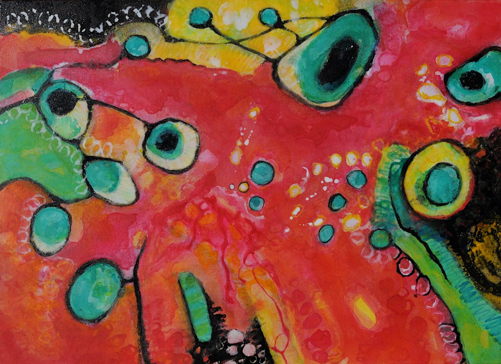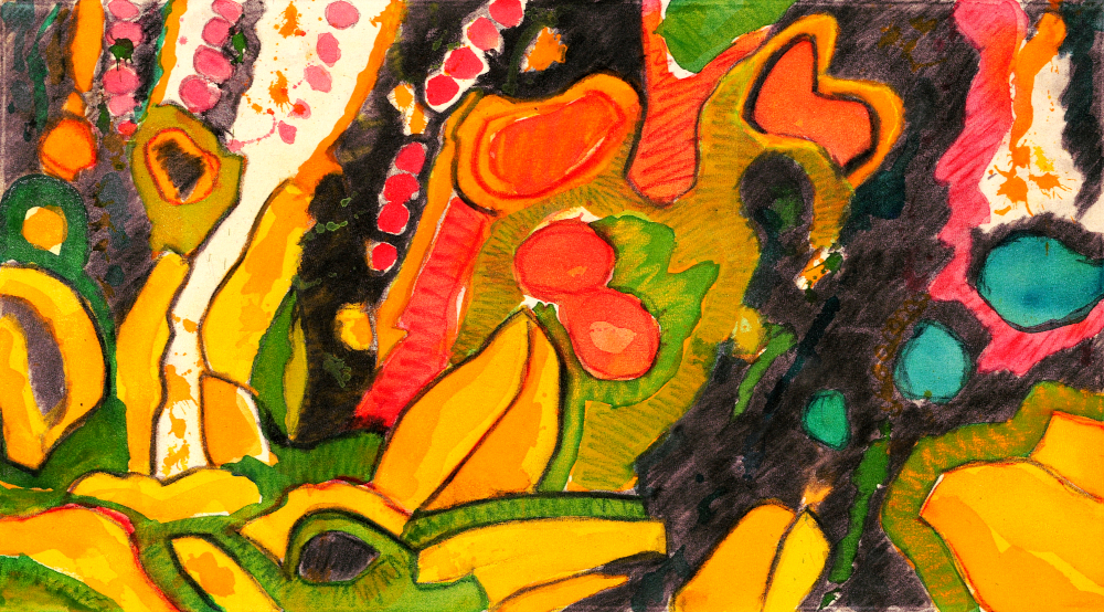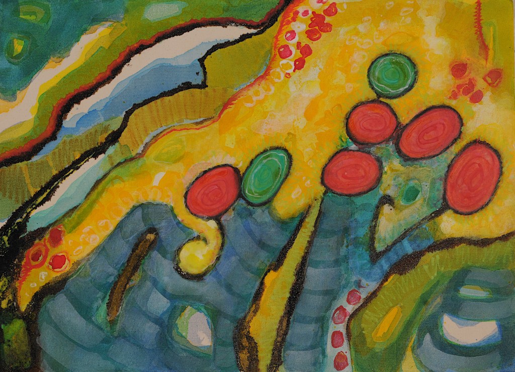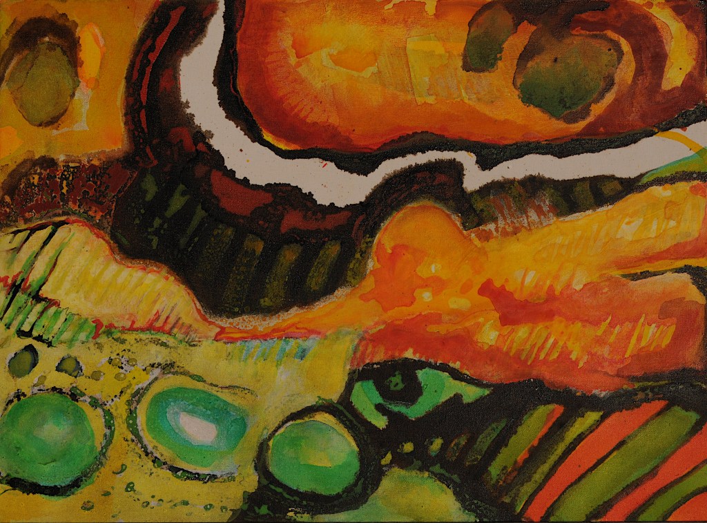 But recently I have been returning to the bright saturated colours of commercially bought paints, and using them to recreate the brilliant colours of the sun on the richness of wild flowers on the cliffs, the patterns of the millennial history of the rocks exposed by the sea, the lights of storm or sunset on the waves…